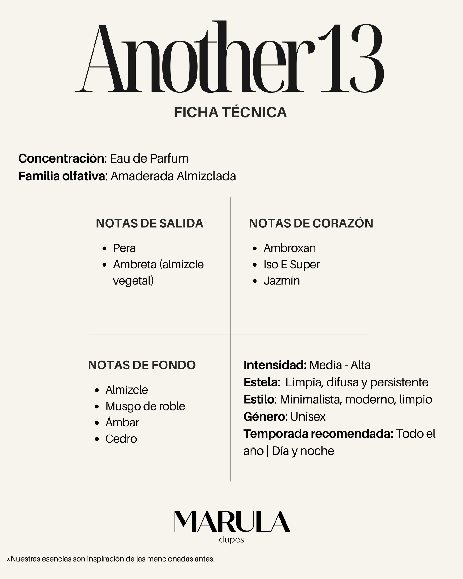 Una fragancia hipnótica, limpia y adictiva. Centrada en el ambroxan, combina una vibra sintética y almizclada con notas sutiles de pera y musgo. Su aroma es íntimo pero persistente, con una estela que parece surgir directamente de la piel. Perfecta para quienes buscan un perfume discreto, elegante y profundamente contemporáneo.