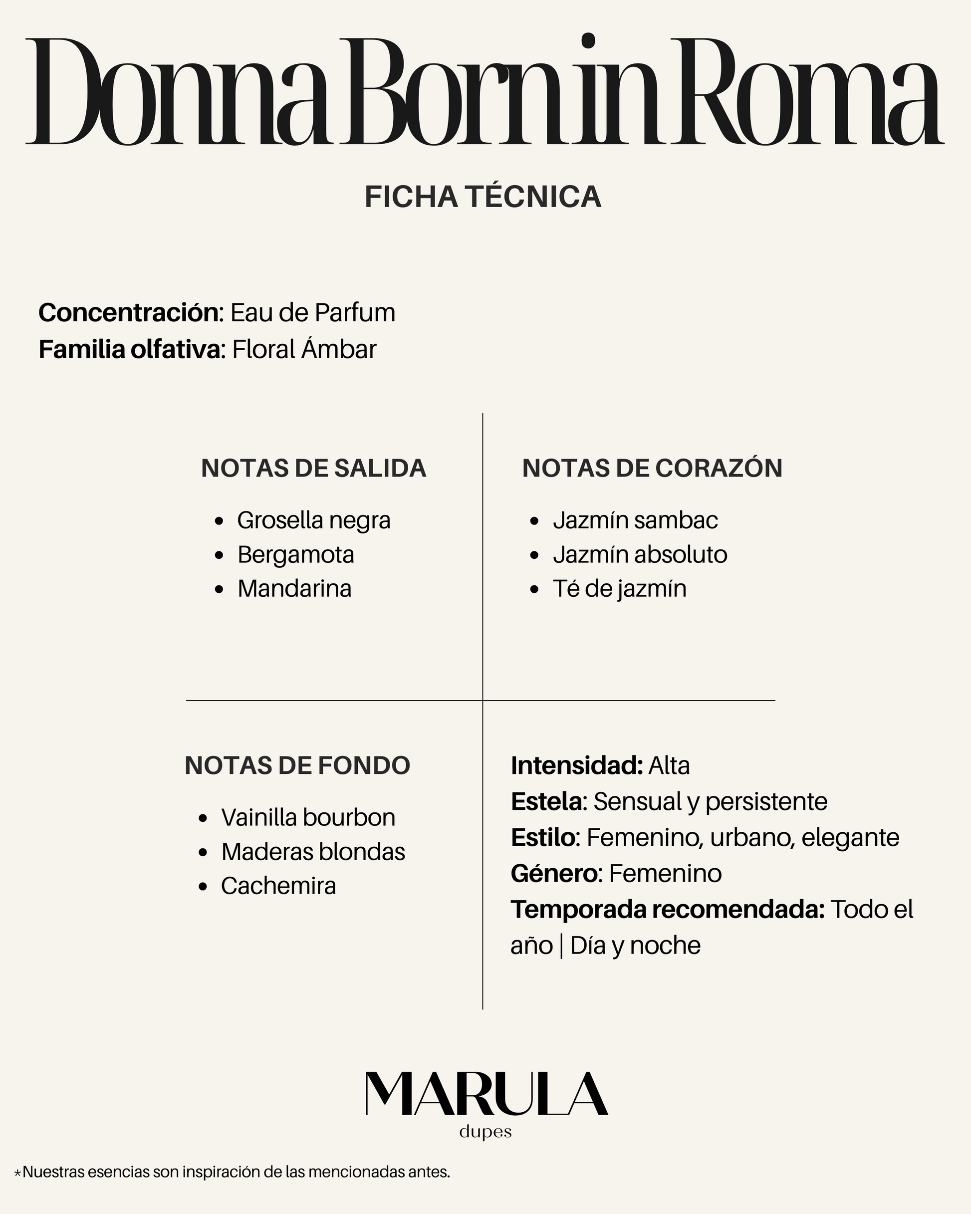 Una fragancia moderna con alma clásica que rinde homenaje a la elegancia rebelde de Roma. La salida vibrante de grosella negra y mandarina da paso a un corazón floral de jazmín, mientras que la base de vainilla bourbon aporta profundidad, calidez y sensualidad. Donna Born in Roma celebra la fuerza femenina con un aroma que es a la vez sofisticado, audaz y profundamente italiano.