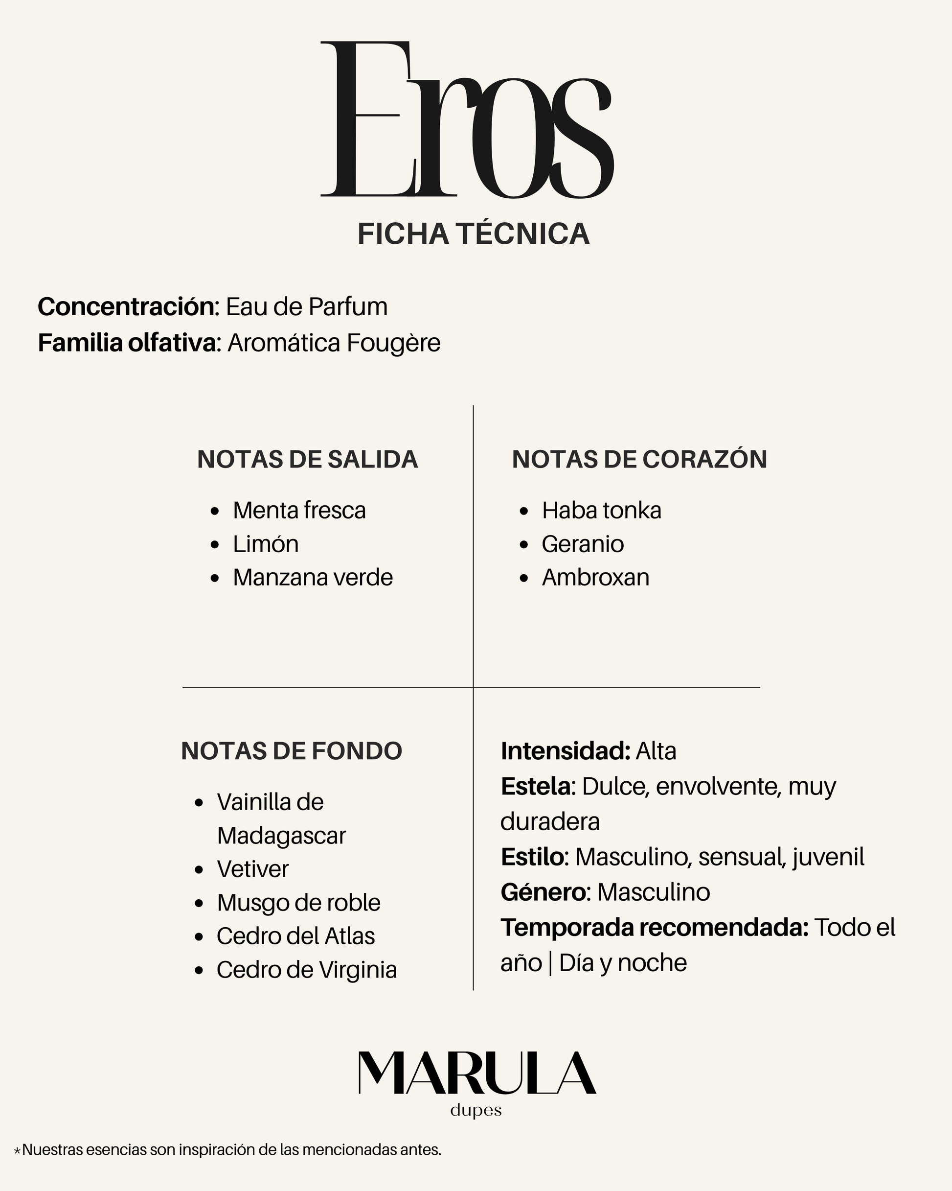 Una fragancia intensa y magnética que celebra la fuerza, la pasión y el deseo masculino. Con una apertura fresca y vibrante, un corazón dulce y especiado, y una base cálida y envolvente, esta interpretación evoca confianza, sensualidad y poder. Perfecta para quienes no pasan desapercibidos.