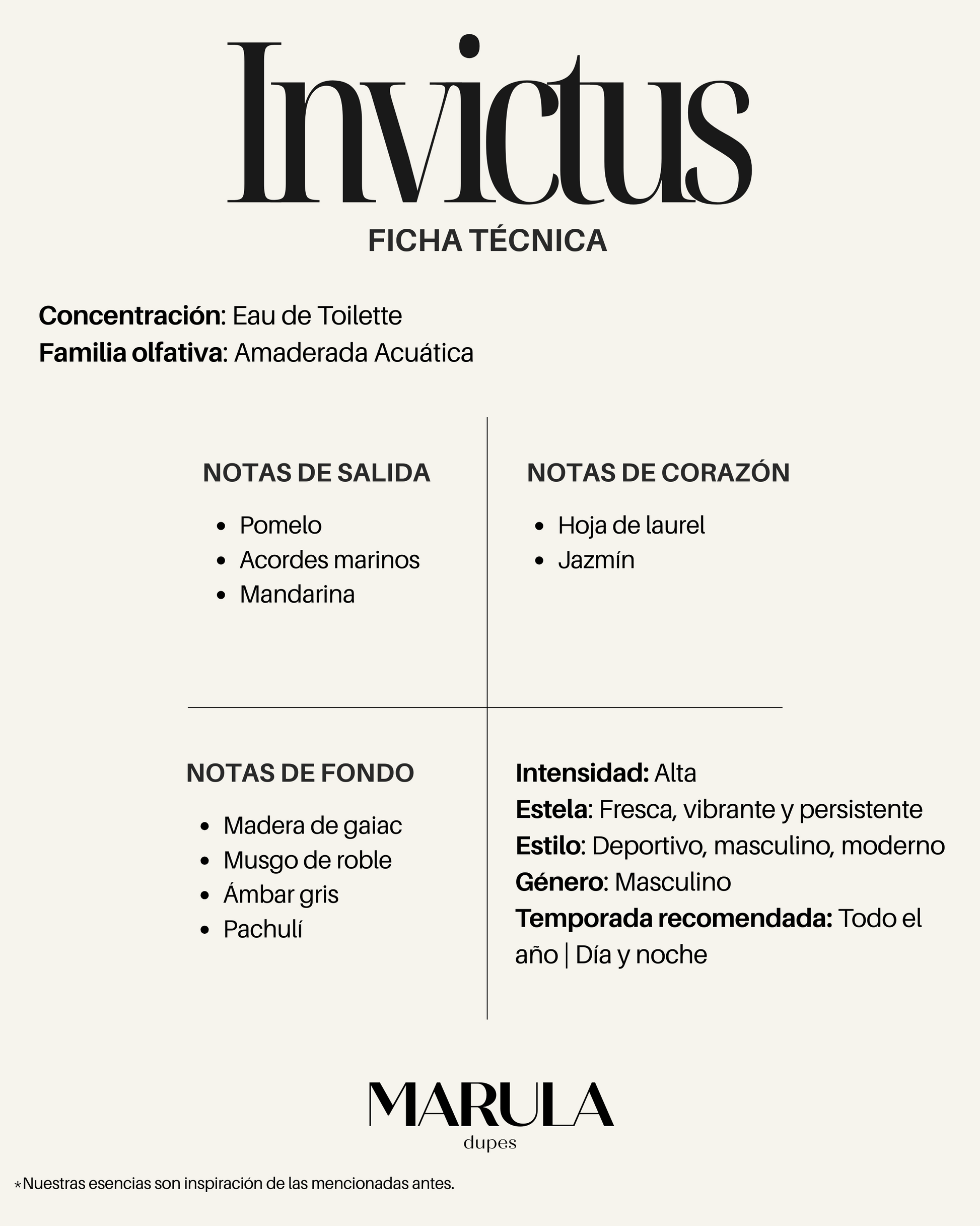 Una fragancia fresca, vibrante y masculina que evoca fuerza, victoria y energía en movimiento. Las notas marinas y cítricas se mezclan con un corazón aromático y una base amaderada, creando un aroma moderno y poderoso. Invictus es ideal para quienes proyectan confianza natural y espíritu competitivo.