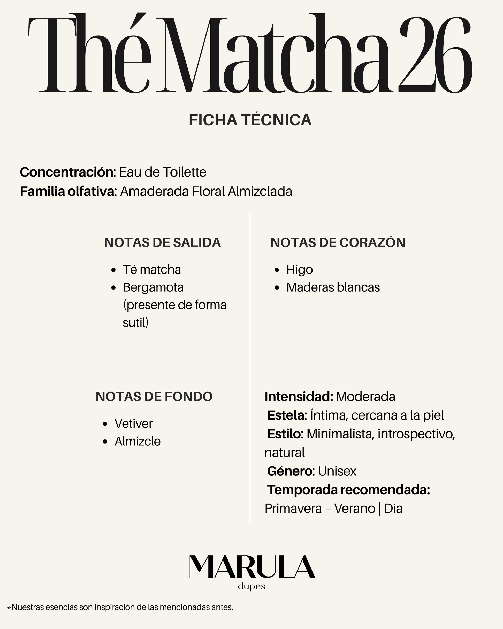 Una fragancia envolvente y serena. Su aroma se abre con el carácter cremoso del té matcha, acompañado de notas verdes suaves y ligeramente dulces. El higo aporta una frescura natural, mientras que las maderas claras y el vetiver le dan profundidad y equilibrio. Es una esencia íntima, cálida y sutilmente terrosa, ideal para quienes buscan una conexión tranquila y auténtica con su fragancia.